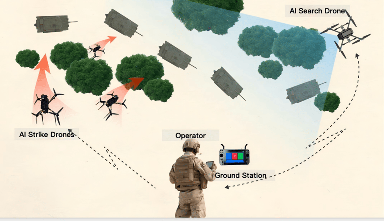 At its core, the AF1 controls a search drone and up to 16 strike drones. The system supports control ranges of up to 15 kilometers, and fiber-optic links can extend communication to 40 kilometers while providing strong resistance to jamming. The search drone conducts autonomous reconnaissance and sends target information in real time. Meanwhile, the strike drones track and lock onto targets rapidly, maintaining performance even under radio interference to ensure reliable mission execution.